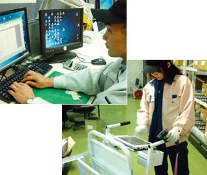 2006年2月に本格稼働した今回のシステムでは、商品を箱ごとに置く「ケース棚」と、単品ずつ置く「ばら棚」に分類して収納する方法を採用。システムの本体であるターミナル(管理側)とナビ付きカート(端末側)が連動していて、ムダなく効率的にピッキング作業を進められるようになりました。